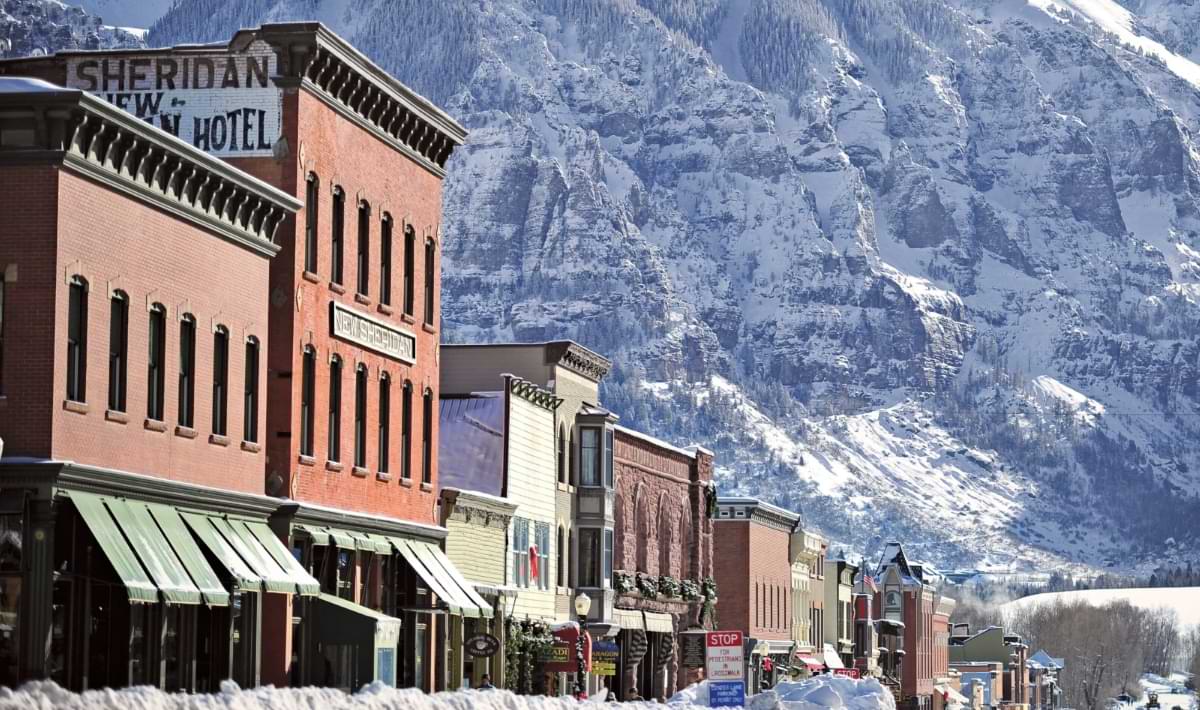 Telluride’s Historic Downtown District is compact, walkable, and packed with character. Victorian storefronts line Colorado Avenue, mountain peaks rise sharply at the end of every street, and restaurants occupy buildings that once served miners, saloons, and early travelers.